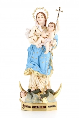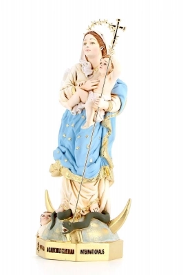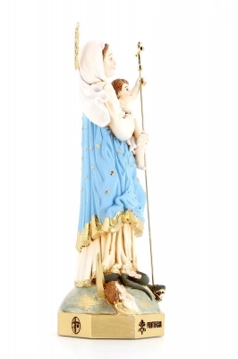 Bellissima statua, raffigurante la Madonna con Gesù Bambino in braccio, impreziosita da elementi in ottone dorato, come la tipica aureola con le stelle e la croce astile che tiene in mano Gesù Bambino. Realizzata in polvere di marmo e dipinta interamente a mano. Eseguita interamente a mano, dallo stampaggio alle finiture, presenta dettagli curati in ogni minimo particolare. Realizzata appositamente per Editrice Shalom, che ne ha seguito direttamente tutta la lavorazione, dalla scultura in plastilina, alla realizzazione del primo modello fino alla fase di pittura.