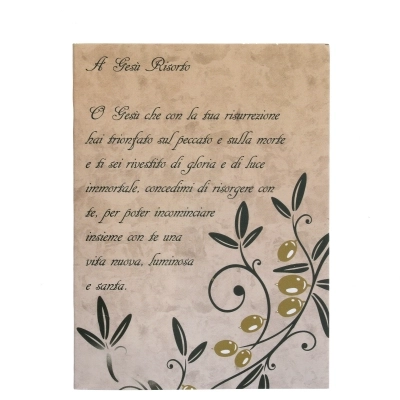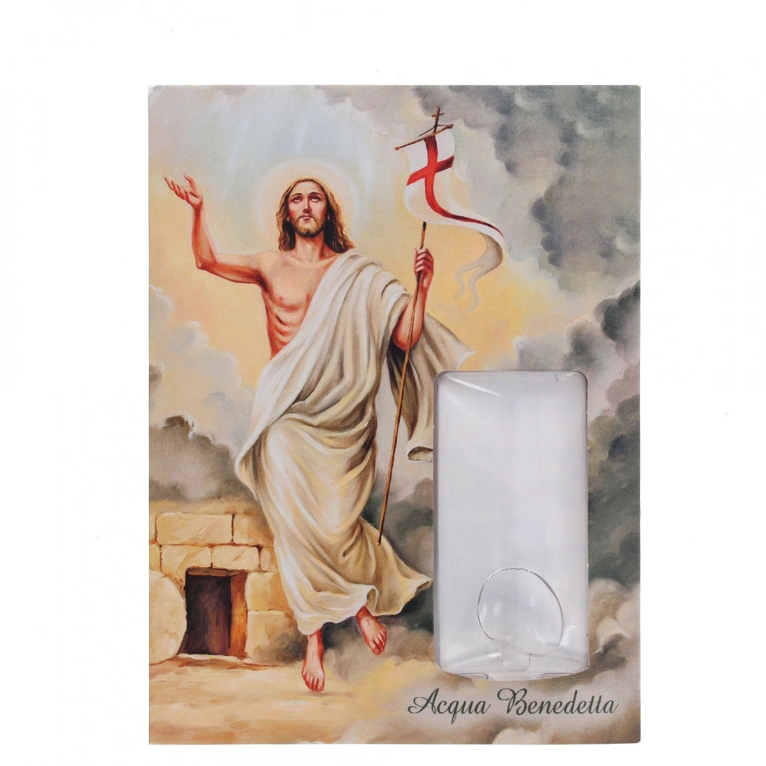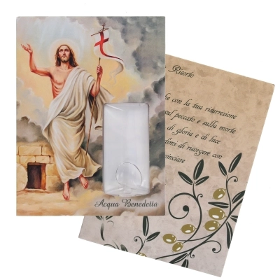 Cartoncino con immagine di Cristo Risorto con confezione di acqua benedetta. Sul retro della confezione c'è una preghiera: " O Gesù che con la tua risurrezione hai trionfato sul peccato e sulla morte e ti sei rivestito di gloria e di luce immortale, concedimi di risorgere con te, per poter incominciare insieme con te una vita nuova, luminosa e santa"
