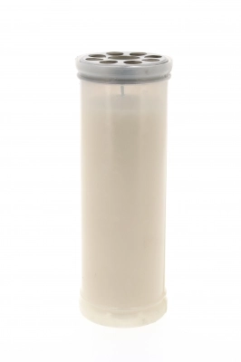 Lumino votivo a cera bianca con portalume in plastica bianca (6,2 cm di diametro e 14,5 cm di altezza). Il lumino è realizzato a mano in Italia da artigiani esperti. La cera ridotta in polvere viene compattata a pressione. La durata è di circa 80 ore.