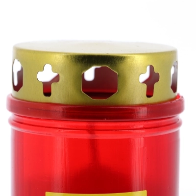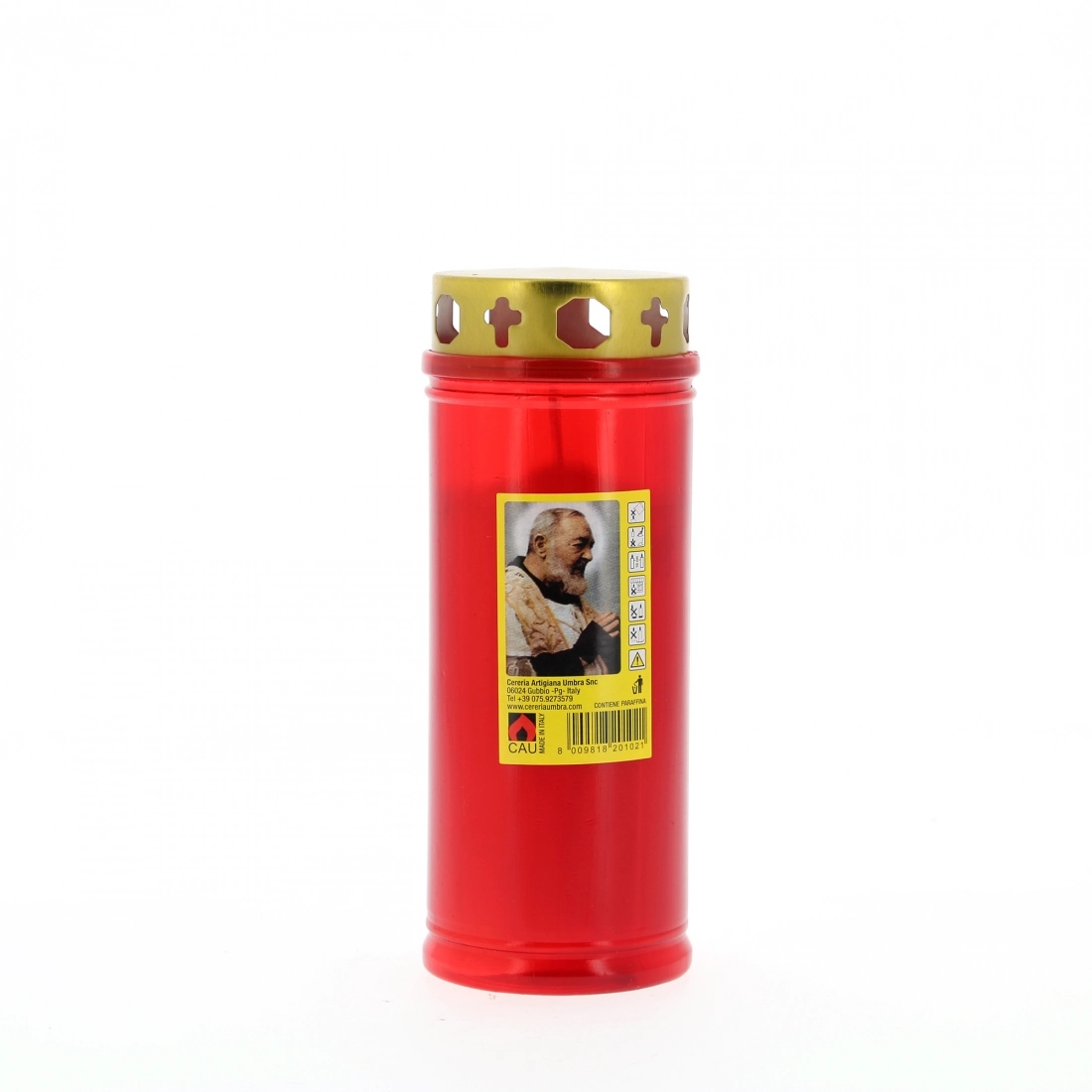 Lumino votivo in plastica rossa, delle dimensioni di 65x175 mm e della durata di circa 42 ore, dotato di parapioggia. Sulla plastica è applicata l’immagine di padre Pio. Prodotto in Italia con materiali e cera di ottima qualità.