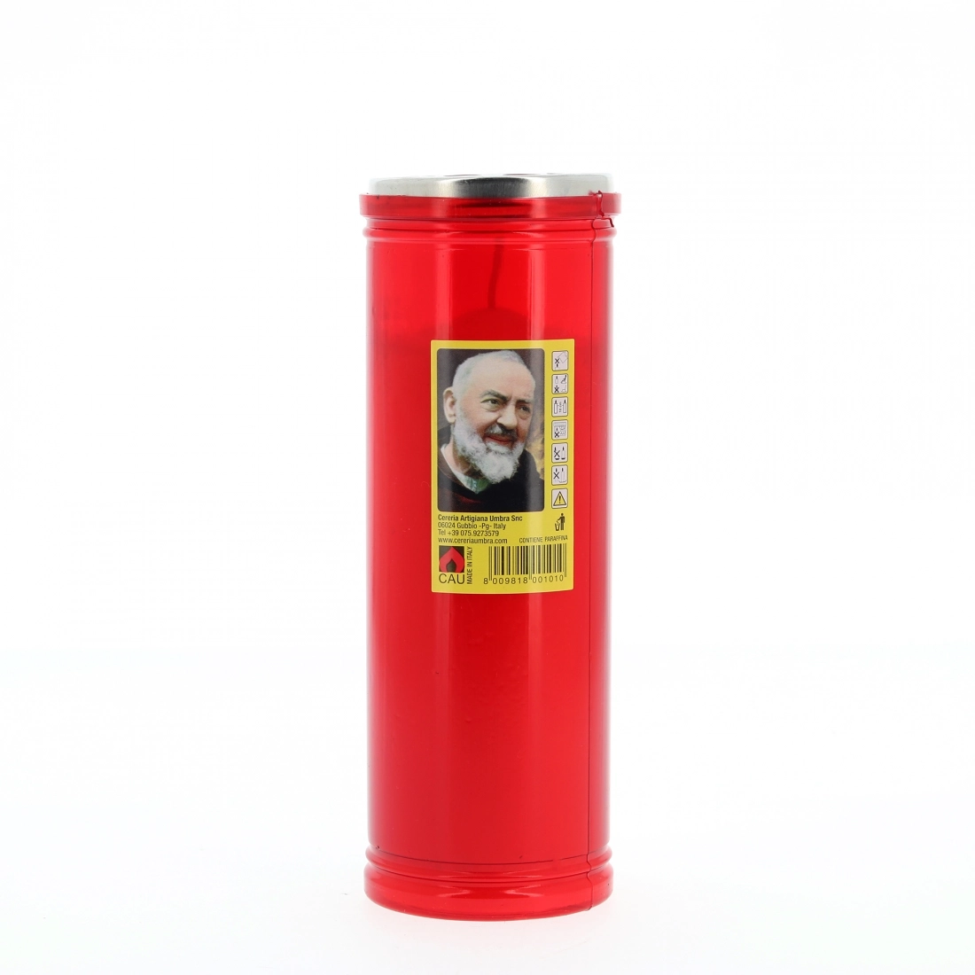 Lumino votivo in plastica rossa, delle dimensioni di 65x190 mm e della durata di circa 56 ore. Sulla plastica è applicata l’immagine di padre Pio. Prodotto in Italia con materiali e cera di ottima qualità.
