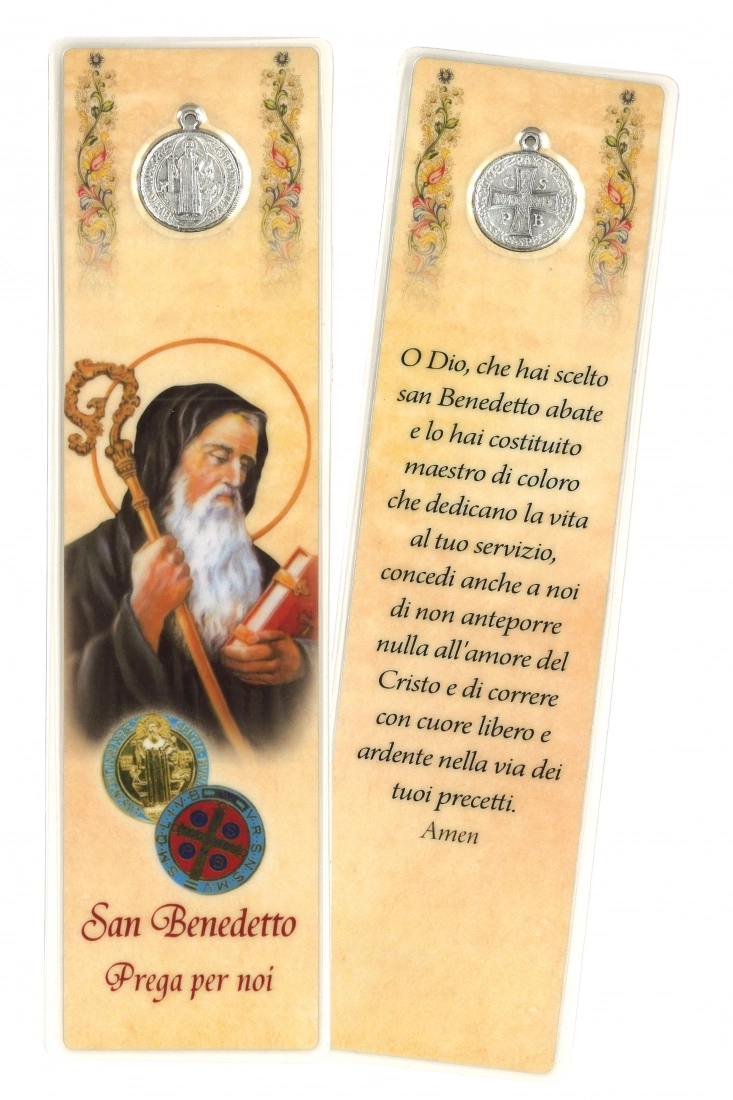 Segnalibro plastificato con medaglia di san Benedetto (dell'altezza di 18 cm). Su un lato è raffigurato san Benedetto, sull'altro c'è una preghiera a lui dedicata. Ottimo prodotto realizzato in Italia.