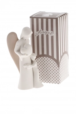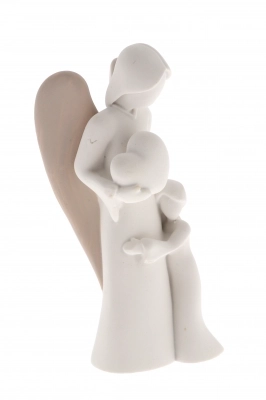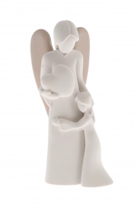 Dolcissimo angelo stilizzato realizzato in resina di colore bianco con ali di color tortora. Regge un cuore e guarda amorevole un fanciullo che lo abbraccia. Ideale per essere regalato a qualcuno di speciale ma anche come bomboniera grazie all'elegante scatola che la accompagna.