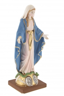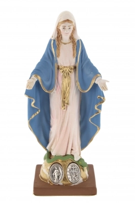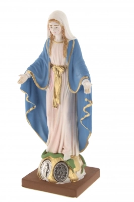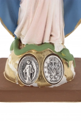 Bellissima statua della Madonna Immacolata (dell'altezza di 15 cm) realizzata interamente in resina colorata, dotata di Medaglia Miracolosa argentata e base. Ideale per essere esposta in qualsiasi ambiente domestico.