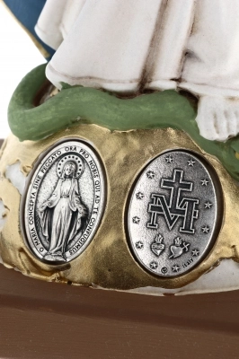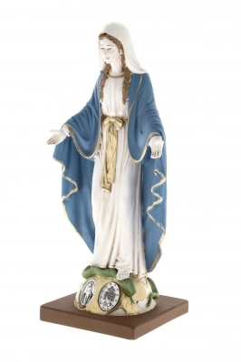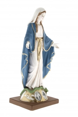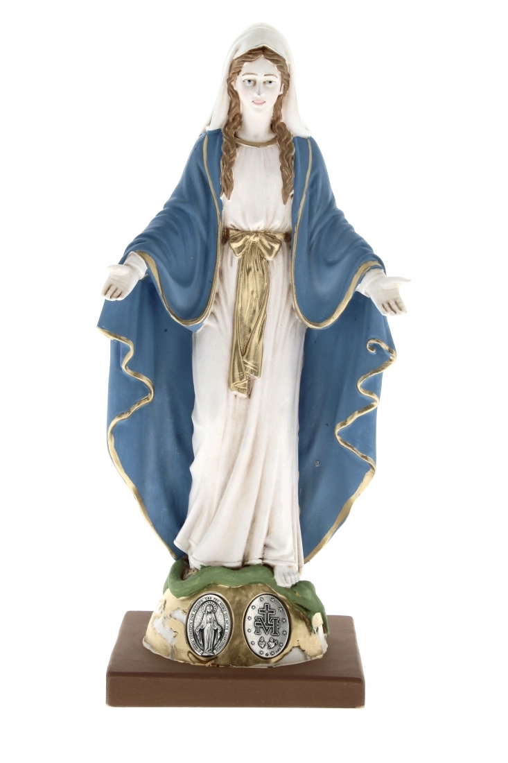 Bellissima statua della Madonna Immacolata (dell'altezza di 30 cm) realizzata interamente in resina colorata, dotata di Medaglia Miracolosa argentata e base. Ideale per essere esposta nei luoghi di culto, ma anche in casa.