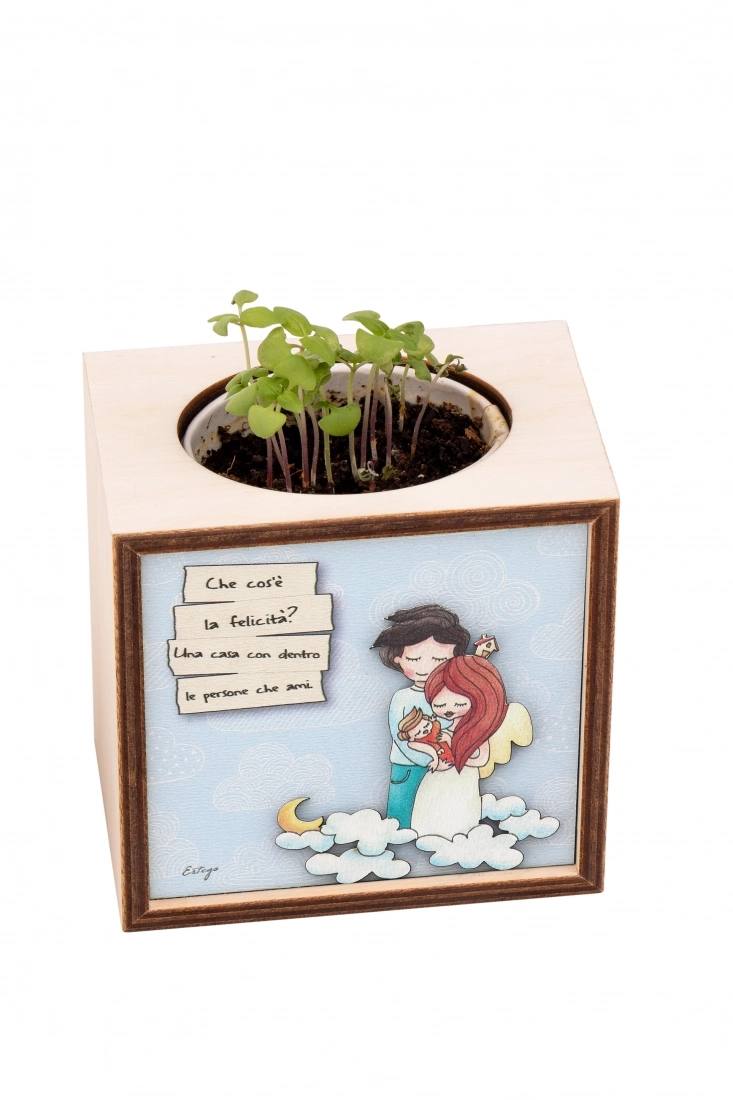 Piantina Kodama in cubo di legno - immagine Cos' è la felicita'? Dimensioni 10x10 cm