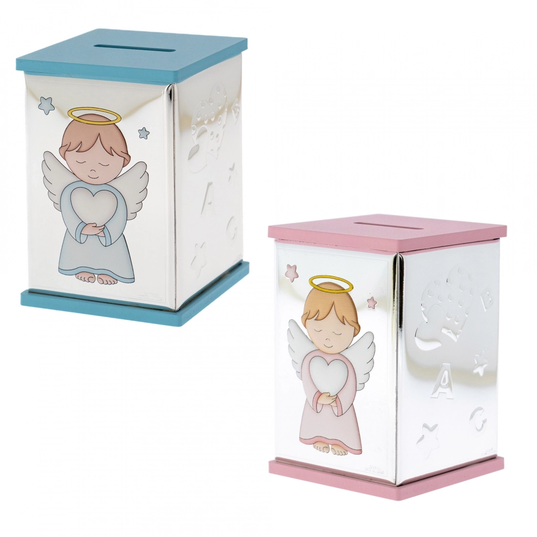 Salvadanaio, azzurro o rosa (misura 8x8 cm e ha un'altezza di 11 cm), con la raffigurazione di un angelo in preghiera in argento Mirò con dettagli colorati. Realizzata in Miro Silver, nuovo metallo che include uno strato di argento puro 999,95%, conferendo al metallo una grande solidità e resistenza all'ossidazione. Ottima idea regalo in occasione di un Battesimo o di una nascita. L'articolo è confezionato nella sua originale scatolina e completo di certificazione del produttore. Realizzato in Italia da un'azienda leader nella produzione di quadri e oggettistica da regalo in argento.
