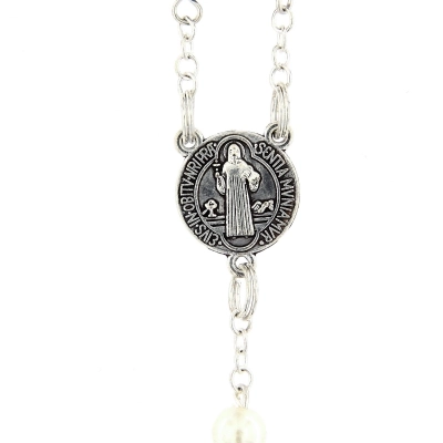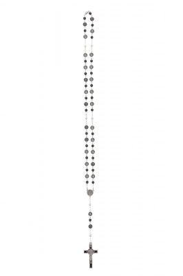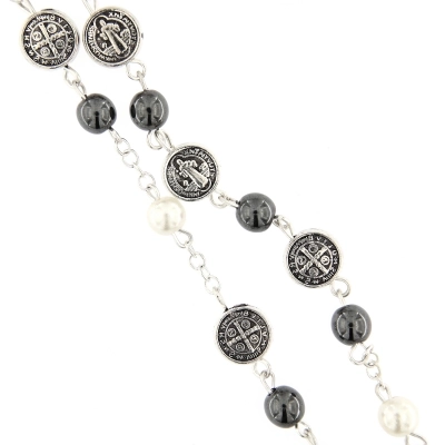Corona del Rosario in metallo color argento, con grani in ematite, del diametro di 6 mm, intervallati da medaglie di san Benedetto dal diametro di 9 mm. I grani in corrispondenza dei quali si recita il "Padre nostro" sono di vetro perlato bianco. Il crocifisso finale è di san Benedetto ed è smaltato. Anche se non è dotata di moschettone, la corona è facilmente indossabile. L'ematite è una pietra dura, infatti prendendola in mano si percepisce l'importanza della corona. Il rosario è molto elegante grazie all'alternanza dei colori bianco e nero ed è adatto pad essere regalato.