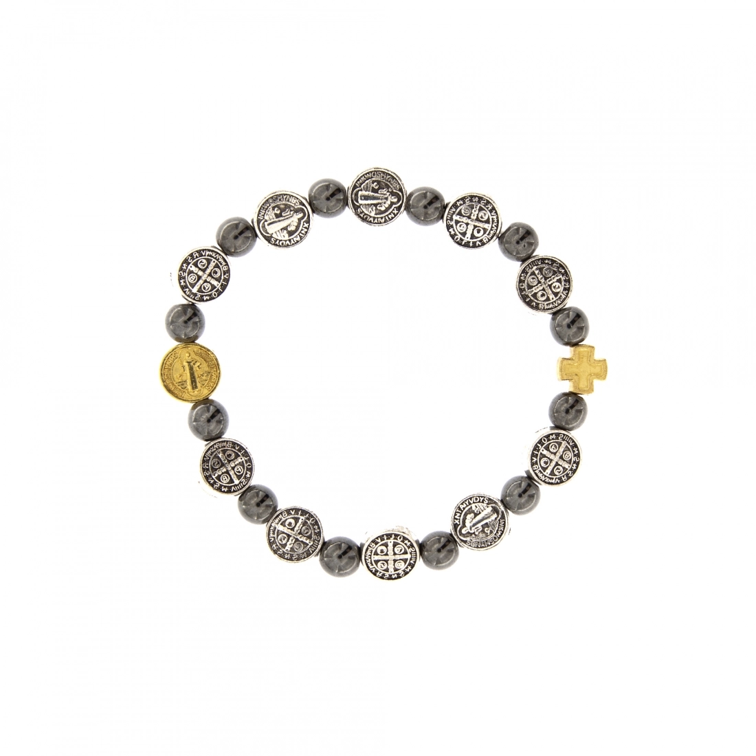Carinissimo e pratico bracciale con grani in Ematite intervallati da medaglie di san Benedetto, per questo si definisce di san Benedetto. Una crocettina dorata arricchisce tutto il bracciale, insieme ad una medaglia benedettina sempre in metallo dorato. Un'ottima idea regalo per un uomo da donare per la festa del papà, dei nonni, ai compleanni o in qualsiasi occasione speciale. Il bracciale è montato su un elastico molto resistente che lo rende adattabile a tutti i polsi. Pratico e comodo da indossare sempre.