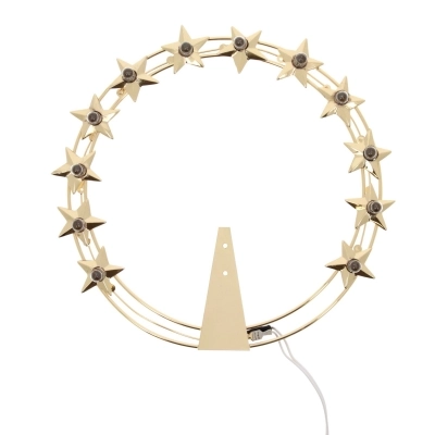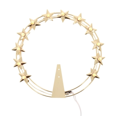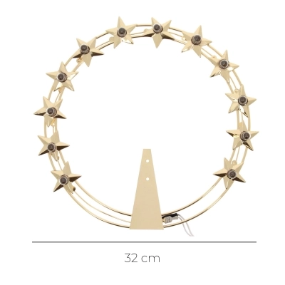 Stellario luminoso con 12 stelle a 5 punte in ottone dorato del diametro di 30 cm. In ognuna delle 12 stelle è stata posta al centro una lampadina, modello mignon a vite con luce calda, che funziona tramite alimentazione elettrica. Questo stellario è interamente prodotto in Italia da un'azienda di esperti artigiani.
