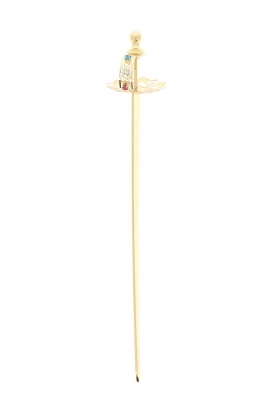 Spada di san Michele Arcangelo, della lunghezza di 26 cm, in ottone dorato con impugnatura in filigrana impreziosita da strass colorati. La larghezza dell'elsa della spada misura 6 cm. Prodotto interamente realizzato in Italia da un'azienda di esperti artigiani.