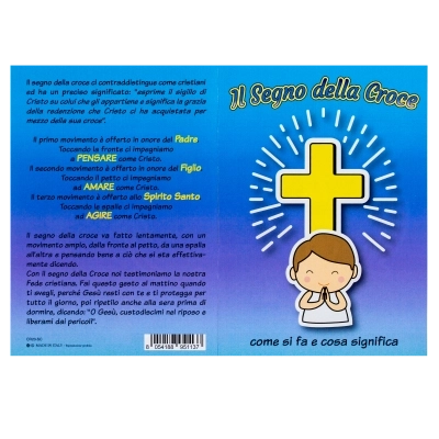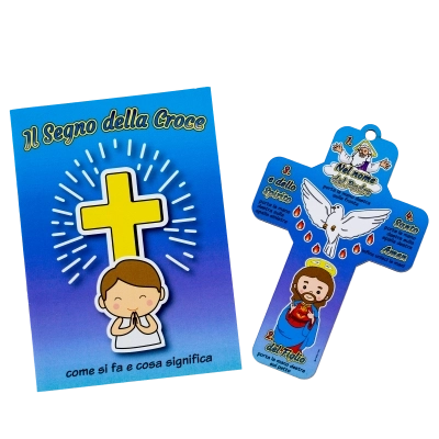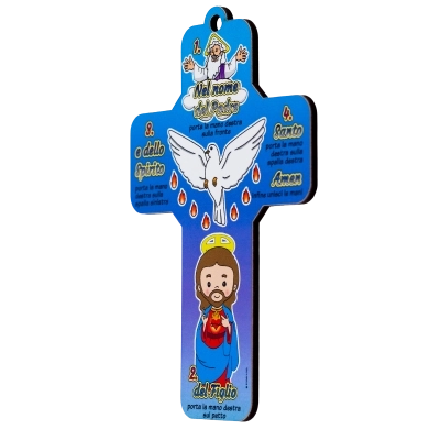 Croce in legno con Segno della Croce illustrato, pensata per accompagnare bambini, famiglie e catechisti nell’apprendimento della preghiera fondamentale della fede cristiana. La croce raffigura in modo semplice e colorato le tre Persone della Trinità – Padre, Figlio e Spirito Santo – con indicazioni chiare dei gesti da compiere durante il Segno della Croce, rendendola uno strumento educativo e spirituale di grande valore.