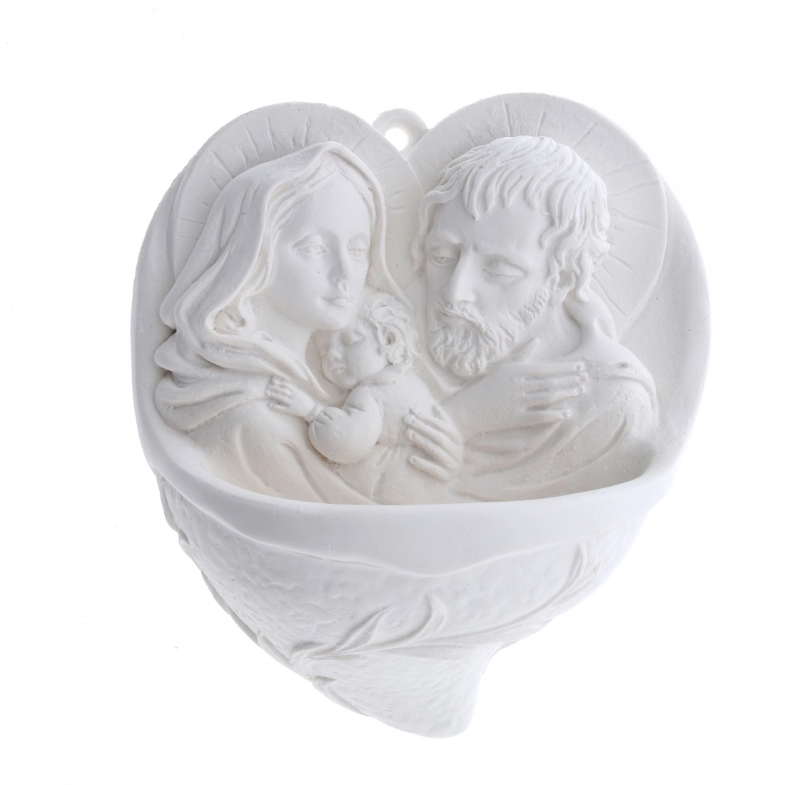 Acquasantiera in resina bianca, dell'altezza di 12 cm. È a forma di cuore e rappresenta la Sacra Famiglia. Realizzata in Italia, può essere usata sia in luoghi di culto sia in casa. Può essere regalata o utilizzata come bomboniera, come segno di protezione. L'acqua santa infatti, è considerata un mezzo di purificazione e benedizione, utilizzata per proteggere e santificare le persone, gli oggetti e gli ambienti. È un simbolo di fede e di protezione spirituale per i fedeli. Inoltre, l'acquasantiera rappresenta un punto di riferimento per la preghiera e la riflessione all'interno delle chiese e delle case dei credenti.