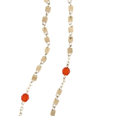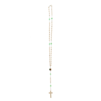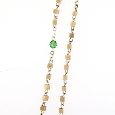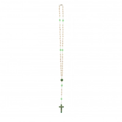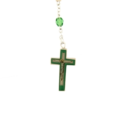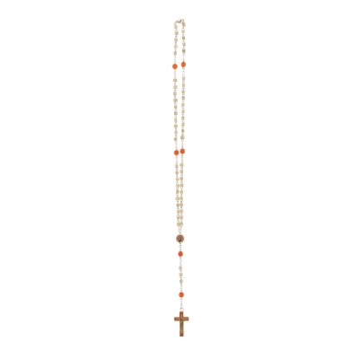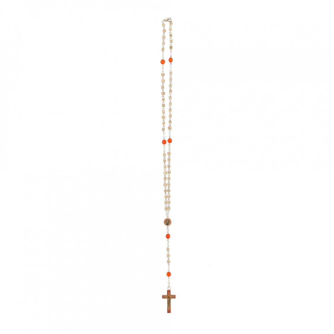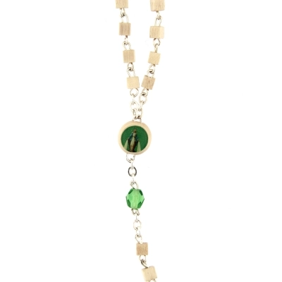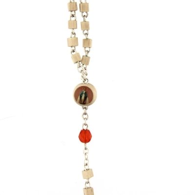 Deliziosa e originale corona del Rosario, con particolari grani a forma di cubetto in legno chiaro, resa ancora più raffinata dalla presenza dei grani del Pater in simil cristallo colorato. Sulla crociera è presente un'immagine adesiva resinata che raffigura la Madonna Immacolata. In una delle varianti è presente anche un'ulteriore immagine resinata, posta nel retro della crociera, che raffigura san Francesco da Paola. Anche la croce finale presenta un'immagine resinata che raffigura Gesù in croce. La corona è indossabile grazie al moschettone che ne consente l'apertura