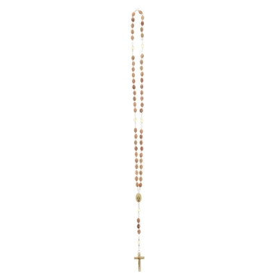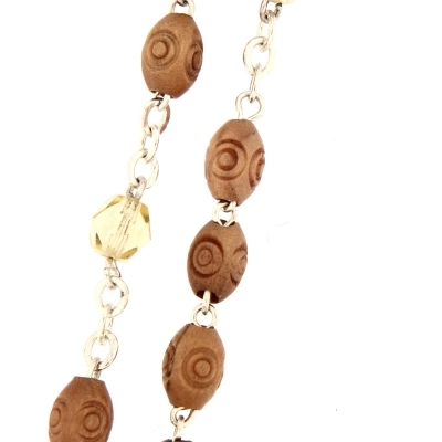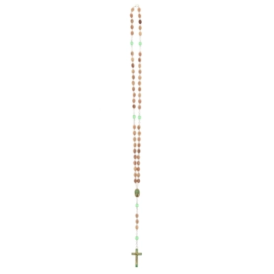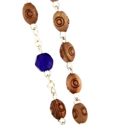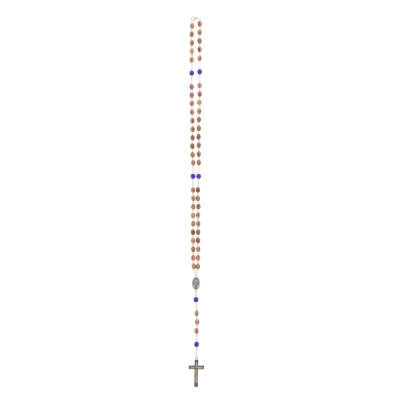 Carinissima corona del Rosario con grani in legno lavorato ovale, impreziosita dai grani del Pater in simil cristallo colorato. Sulla crociera è presente un'immagine adesiva resinata, raffigurante la Madonna Immacolata, che riprende il colore dei grani del Pater. Anche la croce finale presenta un'immagine resinata che raffigura Gesù in croce. La corona è indossabile grazie al moschettone che ne consente l'apertura.