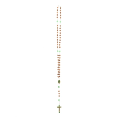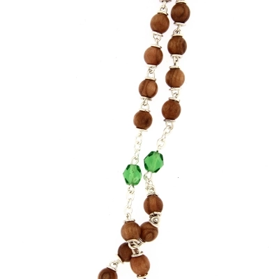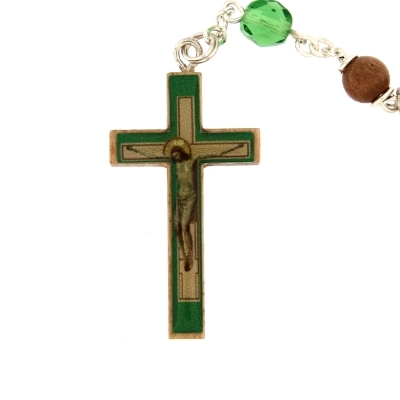 Carinissima e originale corona del Rosario con grani in legno tondo, impreziosita dai grani del Pater in simil cristallo verde. Sulla crociera è presente un'immagine adesiva resinata, raffigurante la Madonna Immacolata, che riprende il colore dei grani del Pater. Anche la croce finale presenta un'immagine resinata che raffigura Gesù in croce. La corona è indossabile grazie al moschettone che ne consente l'apertura.