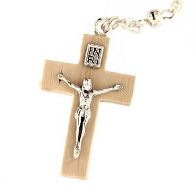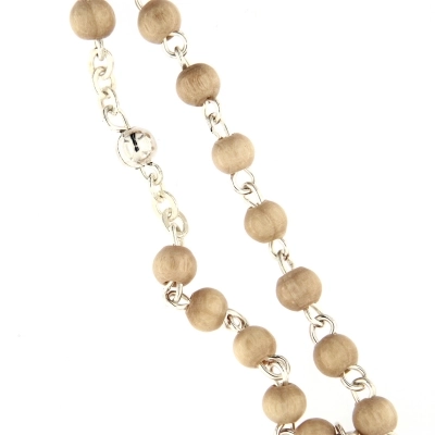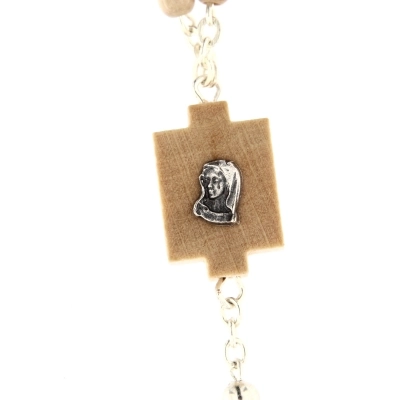 Elegantissima e raffinata corona del Rosario con i grani in legno d'acero, intervallati dai grani Pater in metallo color argento. La crociera, sempre in legno della stessa colorazione del grano, presenta un dettaglio in metallo che raffigura il volto di Maria. La croce finale è anch'essa impreziosita dal corpo di Cristo in metallo color argento. La corona è indossabile grazie al moschettone che ne consente l'apertura.