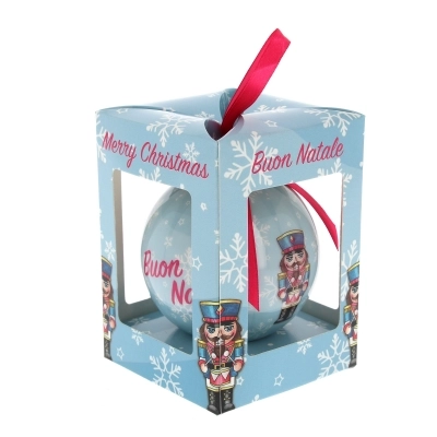 Simpatica pallina natalizia (del diametro di 7,5 cm) inserita all'interno di una bella confezione in cartoncino che la rende adatta per essere regalata. Sulla pallina è disegnato un simpatico Schiaccianoci e sulla confezione l'augurio di un buon Natale (Merry Christmas). Bellissimo articolo dai colori vivaci, da acquistare per sé stessi o da regalare a qualcuno di speciale per augurargli un sereno Natale.
