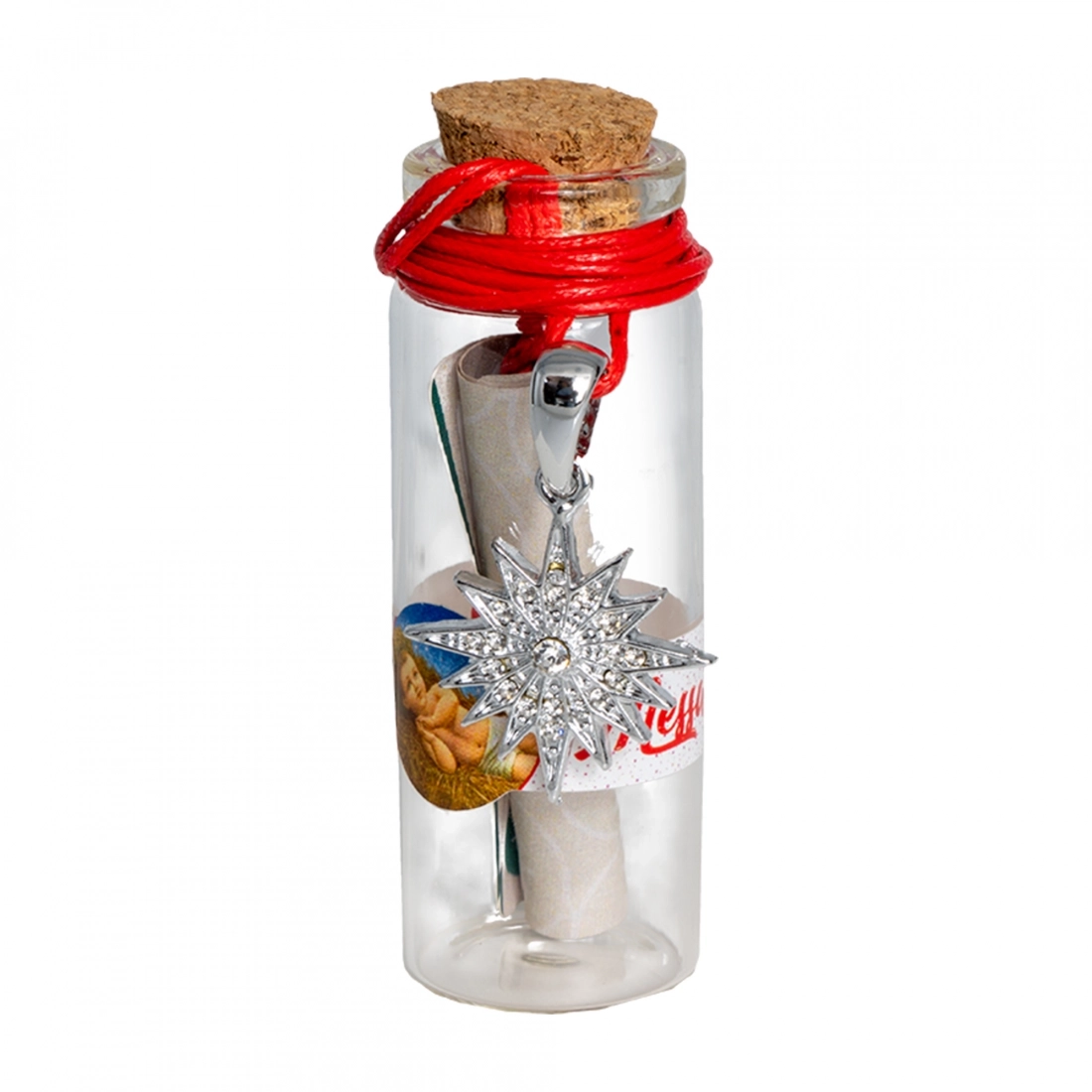 Bottiglietta in vetro con tappo in sughero. All’interno contiene un biglietto con frasi sul Natale. La bottiglietta è corredata da un ciondolo con la Stella di Betlemme e un cordoncino rosso. Una bellissima idea regalo per il Santo Natale!