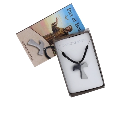 Carinissimo Tau in acciaio completo di cordoncino nero con gancetto, che ne consente l'apertura. Il ciondolo è confezionato in una particolare scatolina con apertura a cassetto, stampata, con l' immagine di san Francesco sul davanti e la basilica di Assisi sul retro. Grazie alla sua leggerezza e al moschettone, il ciondolo è facilmente indossabile al collo e pratico da portare sempre.