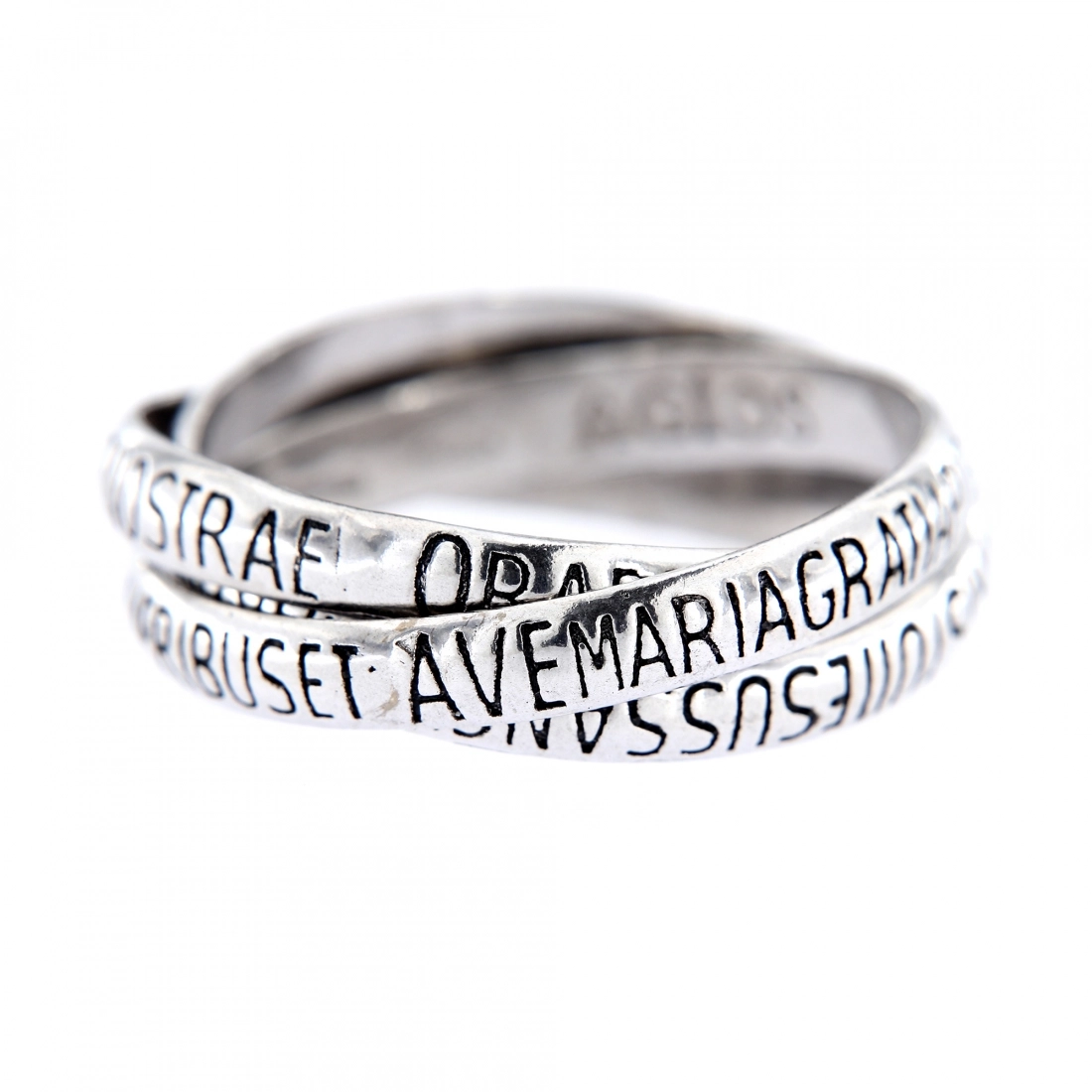 Anello in argento con lavorazione rodio brunito 925, composto da un trio di anelli intrecciati sui quali è incisa, in latino, l'Ave Maria " Ave maria, gratia plena, dominus tecum, benedicta tu in mulieribus et benedictus fructus ventris tui, jesus. sancta maria, mater dei, ora pro nobis peccatoribus, nunc et in hora mortis nostrae".