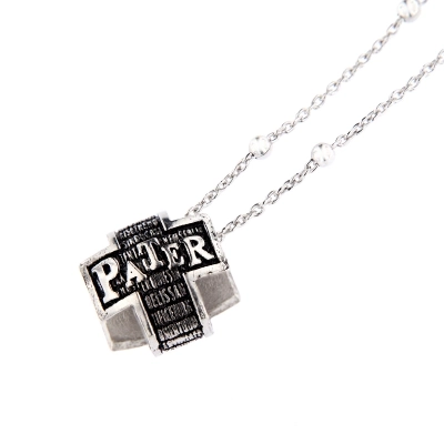 La collana Precem Pater è un girocollo in argento 925 con croce pendente bombata, della lunghezza di 40 cm + 5 di allungo. La croce misura 1,5x1,5 cm e su di essa è riportata la preghiera del Padre Nostro in latino.