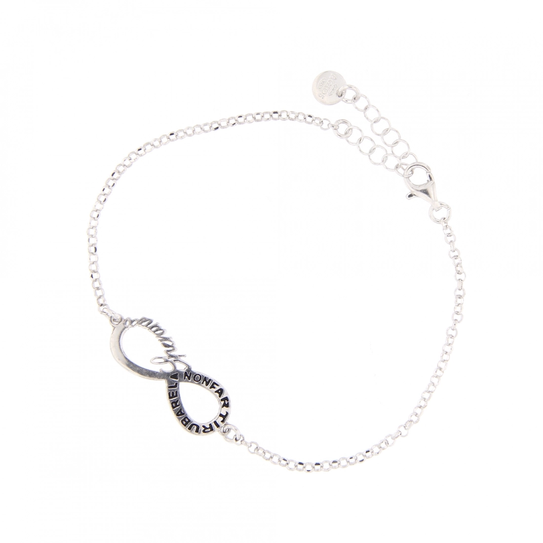 Delizioso bracciale della lunghezza di 20 cm in argento 925, con al centro un ciondolo che raffigura il simbolo dell'infinito dalle dimensioni di 2,5x1 cm su cui è riportata la celebre frase di Papa Francesco " Non farti rubare la speranza".