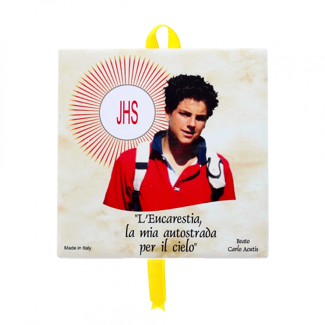 Deliziosa tavoletta in ceramica con nastrino per essere appesa, con serigrafia dell'immagine del Beato Carlo Acutis. Dimensioni 10x10 cm