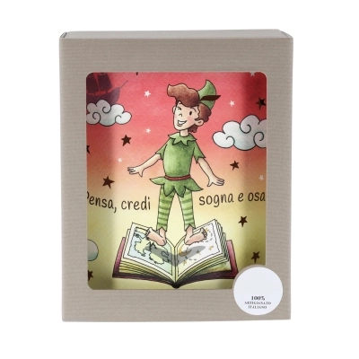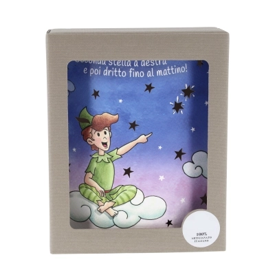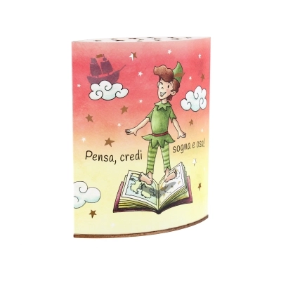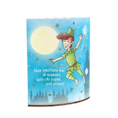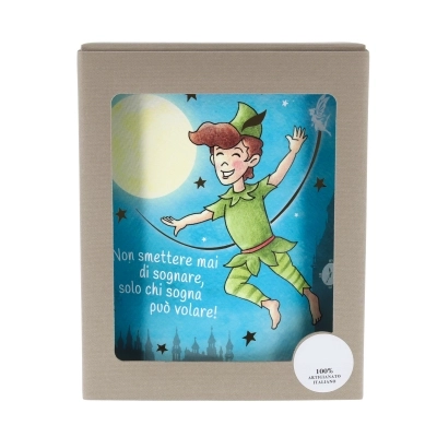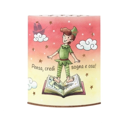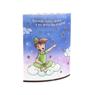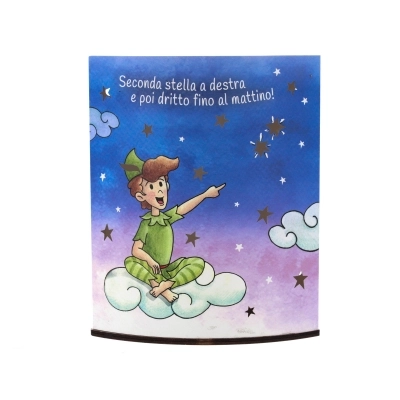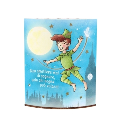 Carinissima lampada da compagnia in carta da appendere o da appoggio con immagini di Peter Pan e frasi emozionali. Disponibile in tre varianti grafiche, ognuna con una diversa frase. Nella parte in carta la lampada ha dei fori a forma di stelle che proiettano la luce nell'ambiente circostante. La lampada è alimentata a batteria. Graziosa idea regalo per qualsiasi ricorrenza, anche per un compleanno. Ottima anche come idea regalo o bomboniera in occasione di Battesimi o Prime Comunioni.