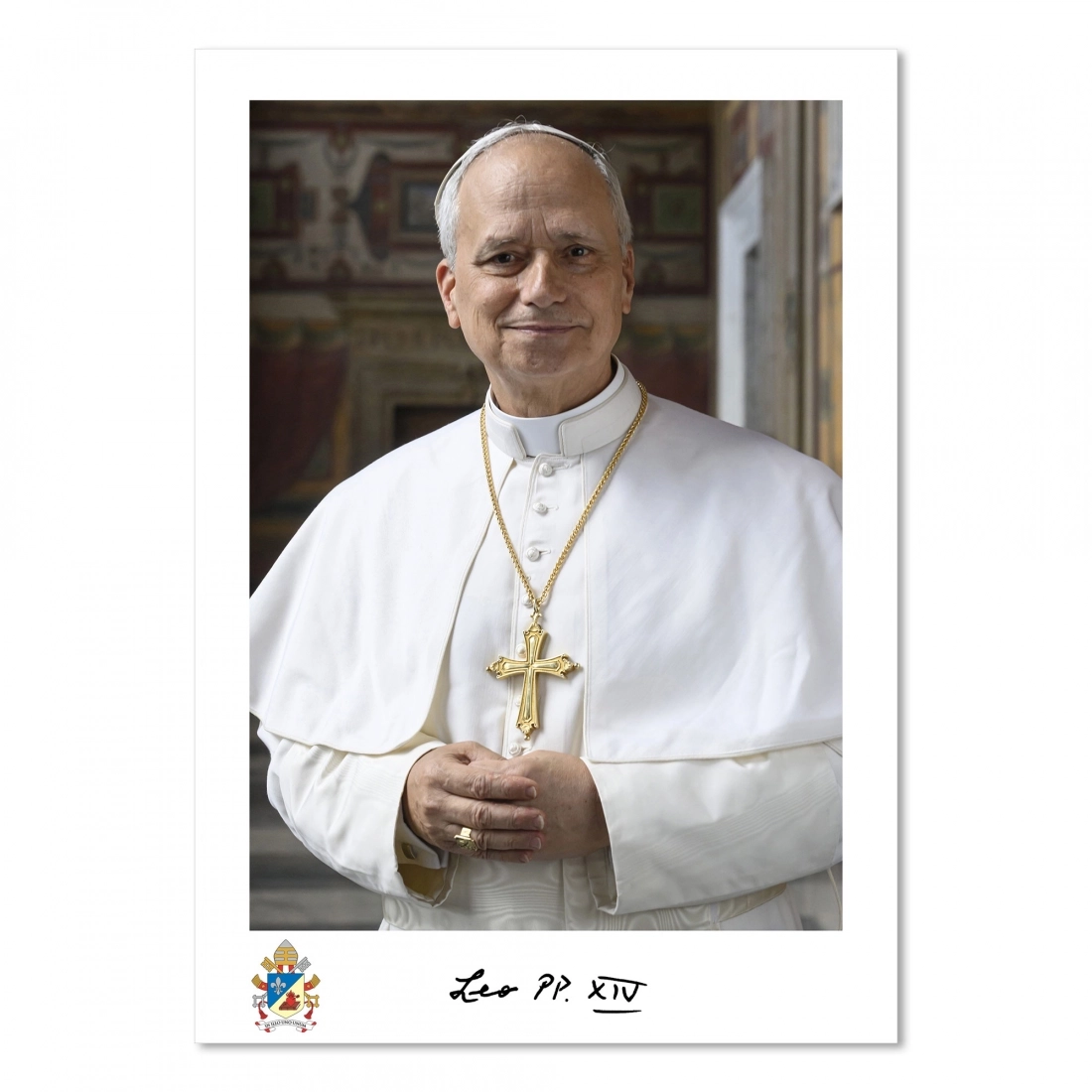 Foto ufficiale di Papa Leone XIV stampata a colori fronte retro con stemma e frase in lingua italiana.