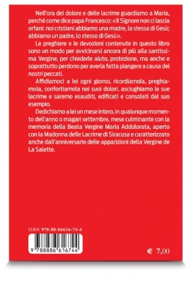 Nell’ora del dolore e delle lacrime guardiamo a Maria, imitiamo colei che rimase accanto alla croce soffrendo e pregando fino alla fine! Le preghiere e le devozioni contenute in questo libro sono un modo per avvicinarsi ancora di più alla santissima Vergine, per chiederle aiuto, protezione, ma anche e soprattutto perdono per averla fatta piangere a causa dei nostri peccati. Affidiamoci a lei ogni giorno attraverso le meravigliose preghiere contenute in questo libro, ricordiamola, confortiamola nei suoi dolori, asciughiamo le sue lacrime e saremo da lei consolati, edificati ed esauditi.