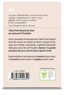 Il libro propone la famosa pratica dei nove primi venerdì del mese in una veste grafica completamente rinnovata e con nuovissime meditazioni per ognuno dei nove primi venerdì del mese. Inoltre, questa ristampa è arricchita da: novena al sacro cuore, coroncina al sacro cuore e supplica al sacro cuore.