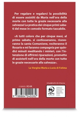 Questo libro risponde a queste e altre domande, illustrando la storia, il significato profondo e l’attualità della pratica dei primi cinque sabati del mese. Offre una guida pratica su come adempiere tutte le condizioni richieste dalla Vergine Maria. Include una riflessione sulla Confessione e uno schema per l’esame di coscienza, una meditazione sul valore dell’Eucaristia, un Santo Rosario meditato e altre meditazioni sui misteri per accompagnare la Vergine Maria per quindici minuti.