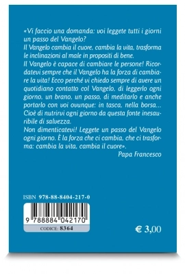 Il volume riporta il testo integrale dei Vangeli (Matteo, Marco, Luca, Giovanni) e degli Atti degli Apostoli nella traduzione ufficiale della Conferenza Episcopale Italiana. Questa edizione agile, economica e pratica, offre la possibilità di «portare sempre con sé un piccolo Vangelo… e leggere durante la giornata un passo del Vangelo», come invita a fare papa Francesco, perché così possiamo «trovare Gesù, perché Gesù è proprio nella sua parola, nel suo Vangelo». Il formato piccolo e comodo consente infatti di portare con sé, in borsa, nello zaino o in tasca il testo evangelico.