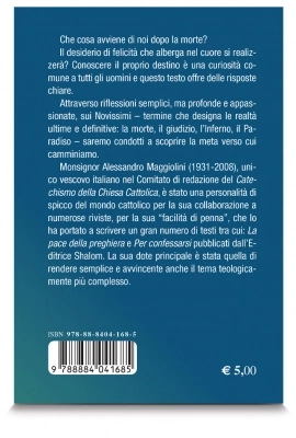 «Che ne sarà di noi dopo la morte?», così si può sintetizzare il contenuto di “I Novissimi. Il destino dell'uomo dopo la morte” che, come l’autore stesso dice, «non è un libro saputo e intricato. Si tratta di un testo che va letto e riletto con pacatezza per gustarne il contenuto. Non ho voluto fare opera di teologia, ma modesta esposizione di catechesi. Semplice, semplice. Con la chiarezza di cui sono stato capace e a cui si lascia ridurre la rivelazione di Dio, senza essere tradita». L’autore, monsignor Alessandro Maggiolini (X 2008), unico vescovo italiano nel Comitato di redazione del Catechismo della Chiesa Cattolica, è stato una personalità di spicco del mondo cattolico per la sua “facilità di penna” che lo ha portato a scrivere un gran numero di testi di cui ricordiamo “La pace della preghiera” e “Per confessarsi”, pubblicati sempre dall’Editrice Shalom, ma soprattutto per la sua dote non comune di rendere semplice e avvincente anche il tema teologicamente più complesso o il mistero di fede più lontano dalla sensibilità popolare.