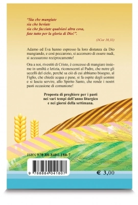Sia che mangiate sia che beviate sia che facciate qualsiasi altra cosa, fate tutto per la gloria di Dio! (1Cor 10,31) Adamo ed Eva hanno espresso la loro distanza da Dio mangiando, e così peccarono, si accorsero di essere nudi, si accusarono reciprocamente! Ora a noi, rivestiti di Cristo, è concesso di mangiare insieme in umiltà e letizia, riconoscenti al Padre, che nutre gli uccelli del cielo, perché sa ciò di cui abbiamo bisogno, al Figlio, che chiede acqua e pane, si fa ospite degli uomini e si lascia servire, allo Spirito Santo, che rende i nostri pasti occasione di comunione! PROPOSTA DI PREGHIERE PER I PASTI NEI VARI TEMPI DELL’ANNO LITURGICO E NEI GIORNI DELLA SETTIMANA.
