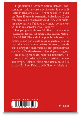 Il giornalista e scrittore Emilio Bonicelli racconta, in modo intenso e avvincente, la storia di Rolando Rivi, che a soli 14 anni ha donato la vita per Gesù. Entrato in seminario, Rolando portò con coraggio la sua testimonianza di fede e di carità, vestendo sempre l’abito talare, segno – come diceva – della sua appartenenza al Signore. Finì per questo vittima del clima di odio contro i sacerdoti diffuso sul finire della guerra. Nell’aprile del 1945 Rolando fu rapito, brutalmente torturato, ucciso per la sola colpa di guidare gli altri ragazzi all’esperienza cristiana. Rolando è un’icona dei molti martiri cristiani del nostro tempo. È stato beatificato il 5 ottobre 2013.
