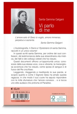 Padre Tito Paolo Zecca ha raccolto in un unico volume l’Autobiografia, il Diario e l’Epistolario di santa Gemma Galgani. In questi scritti la stimmatizzata di Lucca, per ordine dei suoi confessori, dà testimonianza della sua straordinaria vita mistica, dei fatti e dei colloqui celesti che ha vissuto.