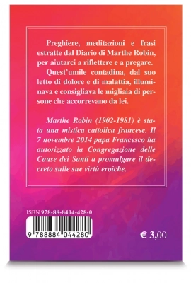 Preghiere, meditazioni e frasi estratte dal Diario di Marthe Robin, per aiutarci a riflettere e a pregare. Quest’umile contadina, dal suo letto di dolore e di malattia, illuminava e consigliava le migliaia di persone che accorrevano da lei.