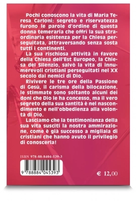 Pochi conoscono la vita di Maria Teresa Carloni: segreto e riservatezza furono le parole d’ordine di questa donna temeraria che offrì la sua straordinaria esistenza per la Chiesa perseguitata, attraversando senza sosta tutti i continenti. La sua rischiosa attività in favore della Chiesa dell’Est Europeo, la Chiesa del Silenzio, salvò la vita di innumerevoli cristiani perseguitati nel XX secolo dai nemici di Dio. Guidata spiritualmente dal suo parroco monsignor Cristoforo Campana (1920-2006) dal 16 aprile 1951 alla morte, ha avuto l’onore di entrare in contatto con i papi Pio XII, Giovanni XXIII, Paolo VI e Giovanni Paolo II e con eminenti pastori della Chiesa. Rivivere le tre ore della passione di Gesù, il carisma della bilocazione, le stimmate sono soltanto alcuni dei doni che Dio le ha concesso, ma il vero segreto della sua santità è nel nascondimento e nell’obbedienza alla volontà di Dio. Lasciamo che la testimonianza della sua vita susciti la nostra ammirazione, come è già successo a migliaia di cristiani che hanno avuto il privilegio di conoscerla!