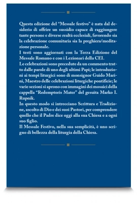 È come un Messalino dedicato alle feste che si può usare per tutta la vita, senza ricomprarlo ogni anno, perché contiene i testi liturgici di tutti e tre i cicli del Lezionario (Anno A, B, C). I testi sono aggiornati alla terza edizione del Messale Romano, uscita nel 2020. Ogni Vangelo è commentato da commentatori d’eccezione: papa Francesco, Benedetto XVI, Giovanni Paolo II e Paolo VI. I Tempi liturgici (Avvento, Natale, Quaresima, Pasqua, Tempo Ordinario) sono introdotti da monsignor Guido Marini. Con questo volume, potrai gustare e vivere appieno la Messa festiva oggi e sempre! L’Editrice Shalom è onorata di aver realizzato questa pubblicazione in coedizione con la Libreria Editrice Vaticana.