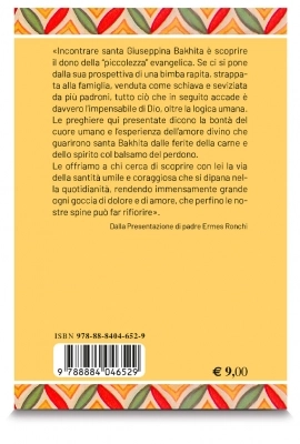 «Le preghiere presentate dicono l’esperienza dell’amore divino che guarirono santa Bakhita dalle ferite della carne e dello spirito col balsamo del perdono. Le offriamo a chi cerca di scoprire con lei la via della santità umile e coraggiosa che si dipana nella quotidianità, rendendo immensamente grande ogni goccia di dolore e di amore, che perfino le nostre spine può far rifiorire» (Ermes Ronchi, dalla Presentazione).