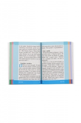 L’uso dei colori permette di trovare facilmente i singoli libri: Vangelo di Matteo (sezione verde), Vangelo di Marco (sezione rossa), Vangelo di Luca (sezione celeste), Vangelo di Giovanni (sezione arancione) e Atti degli Apostoli (sezione BLU)