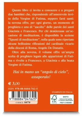 Questo libro ci invita a conoscere e a pregare due bambini che, rispondendo all’amorevole invito della Vergine di Fatima, seppero farsi santi: la novena offre, per ogni giorno, un momento di preghiera e uno di “ascolto” delle parole dei santi Giacinta e Francesco. Per chi desiderasse arricchire la preghiera con la meditazione, è disponibile la sezione “Spunti di meditazione”, nella quale sono riportate alcune bellissime riflessioni del cardinale vicario Angelo De Donatis, tenute nel corso del pellegrinaggio della diocesi di Roma a Fatima.