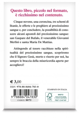 Cinque novene, una coroncina, tre schemi di litanie, le offerte e le preghiere al preziosissimo sangue e, per concludere, la possibilità di conoscere gli apostoli del preziosissimo sangue: san Gaspare del Bufalo, il venerabile Giovanni Merlini e santa Maria De Mattias.