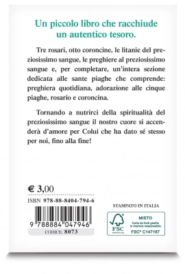 Tre rosari, otto coroncine, le litanie del preziosissimo sangue, le preghiere al preziosissimo sangue e, per completare, un’intera sezione dedicata alle sante piaghe che comprende: preghiera quotidiana, adorazione alle cinque piaghe, rosario e coroncina.
