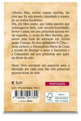 Este livro apresenta todos os meios necessários para vivermos a devoção das Seis Primeiras Quintas-feiras, dada por Jesus à Beata Alexandrina de Balasar. É uma devoção que coloca ao centro a Santa Eucaristia e a adoração ao Santíssimo Sacramento.