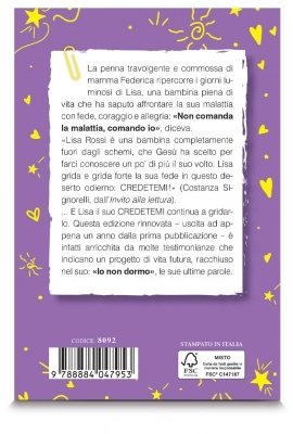 La penna travolgente e commossa di mamma Federica ripercorre i giorni luminosi di Lisa: una bambina piena di vita che ha saputo affrontare la sua malattia con fede, coraggio e allegria: «Non comanda la malattia, comando io», diceva.