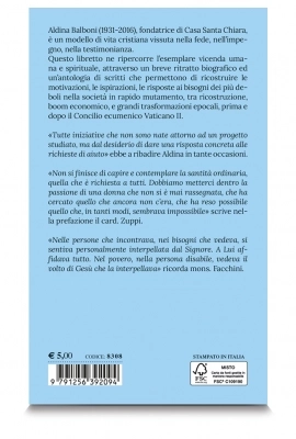 Il libro ripercorre l’esperienza semplice e al tempo stesso eccezionale di Aldina Balboni (1931-2016), fondatrice di Casa Santa Chiara: una donna di fede incrollabile e amore instancabile verso i più fragili. Attraverso la sua storia e i suoi scritti, scopriamo il cuore di una testimone cristiana che, con coraggio e dedizione, ha risposto ai bisogni dei più deboli, illuminando con speranza e carità un’epoca di profonde trasformazioni sociali ed ecclesiali.