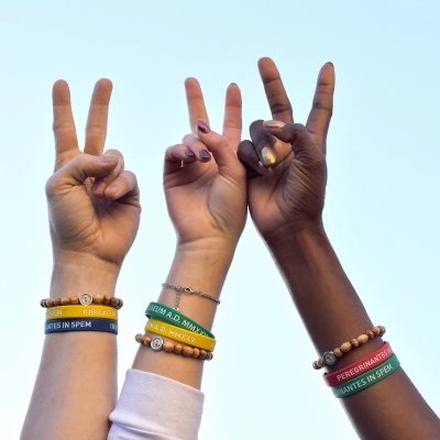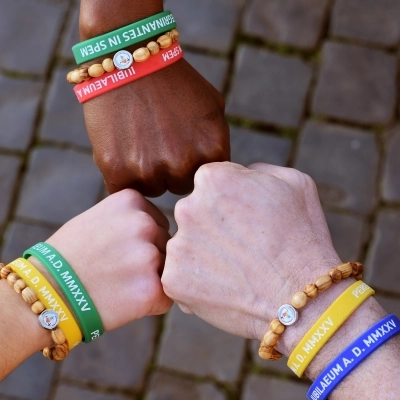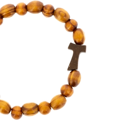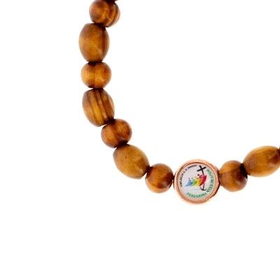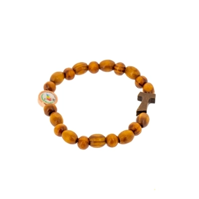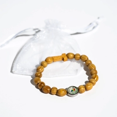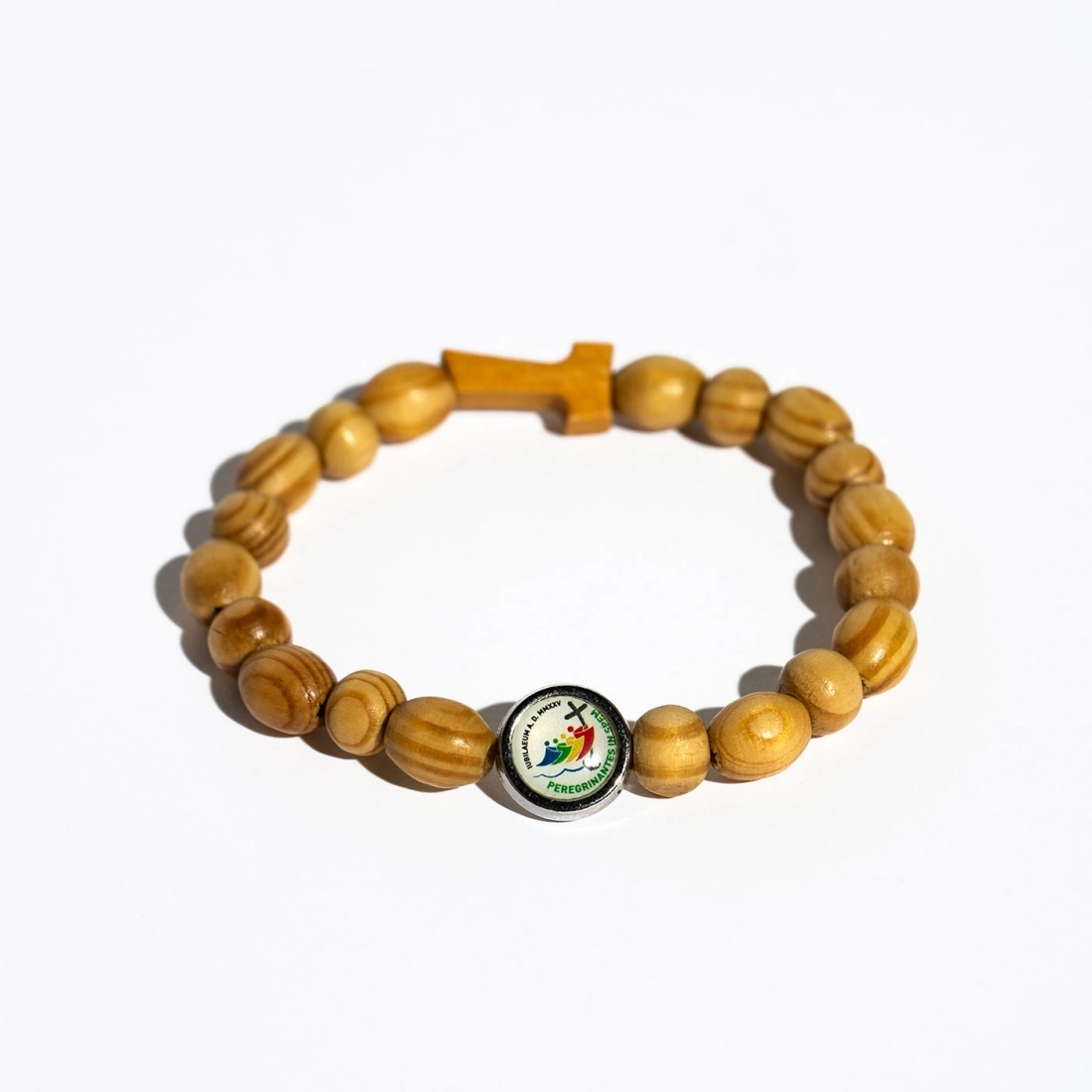 Bracciale in legno, composto da 10 grani ovali di dimensioni 1x0,8 cm che compongono una decina del rosario, alternati a grani tondi di diametro 0,8 cm. Il bracciale è arricchito da una crocetta Tau e da una medaglietta in metallo con stampato il logo ufficiale del Giubileo. Il bracciale è inserito in un elegante sacchetto di organza bianco. Il diametro del bracciale è di 8 cm.